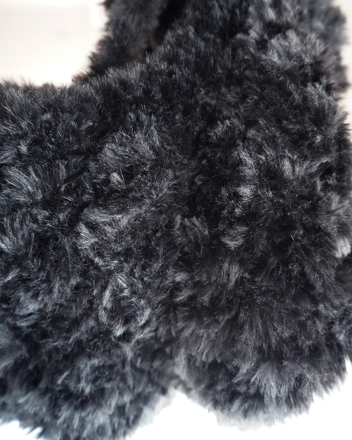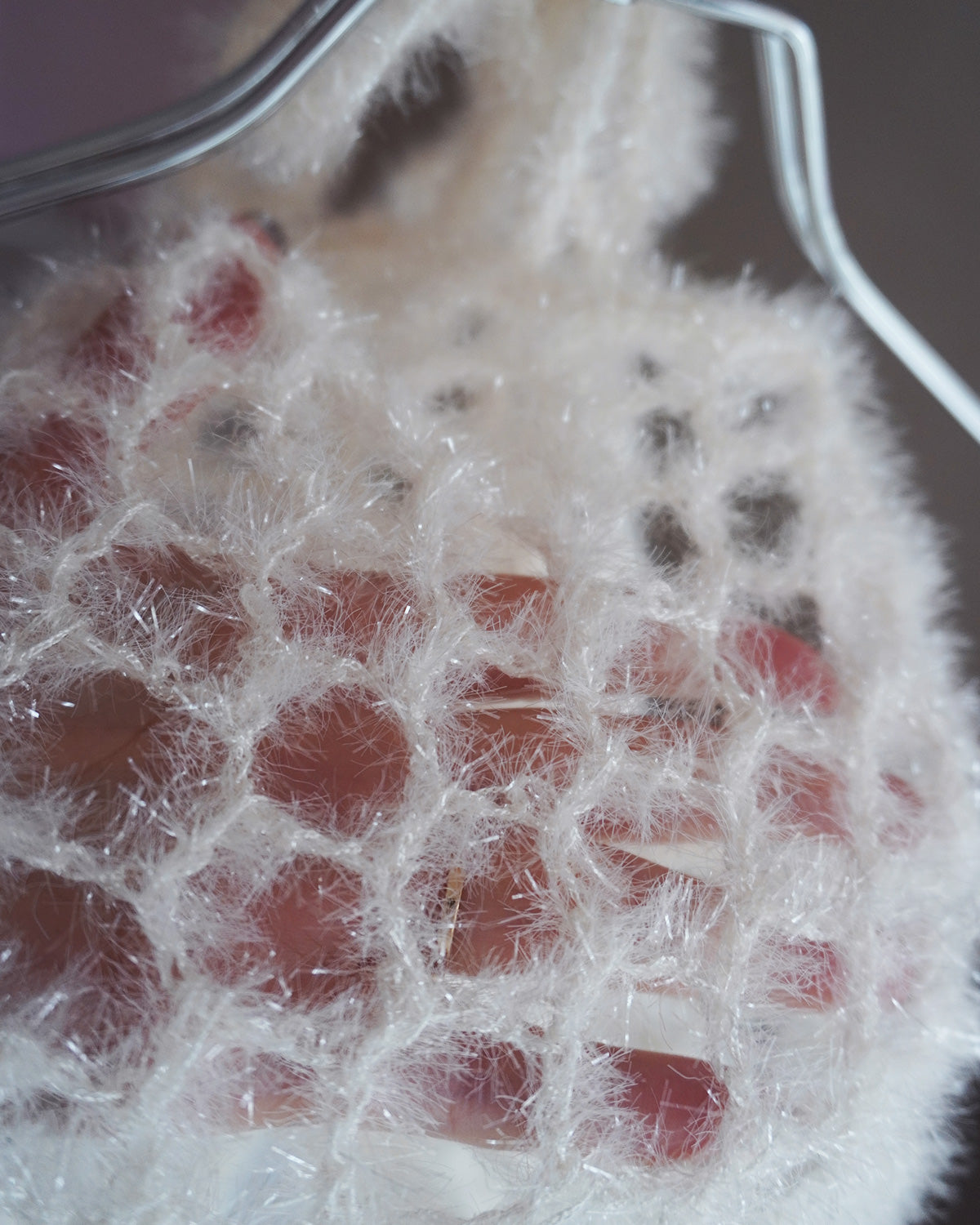 キラキラした毛糸は肌が反応する可能性もございますのでTシャツやシャツなど肌に直接触れないレイヤードをオススメ致します。