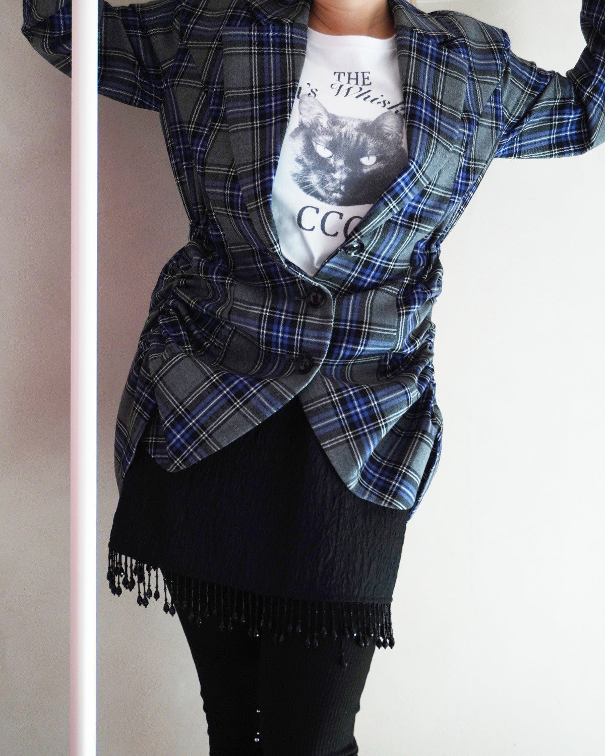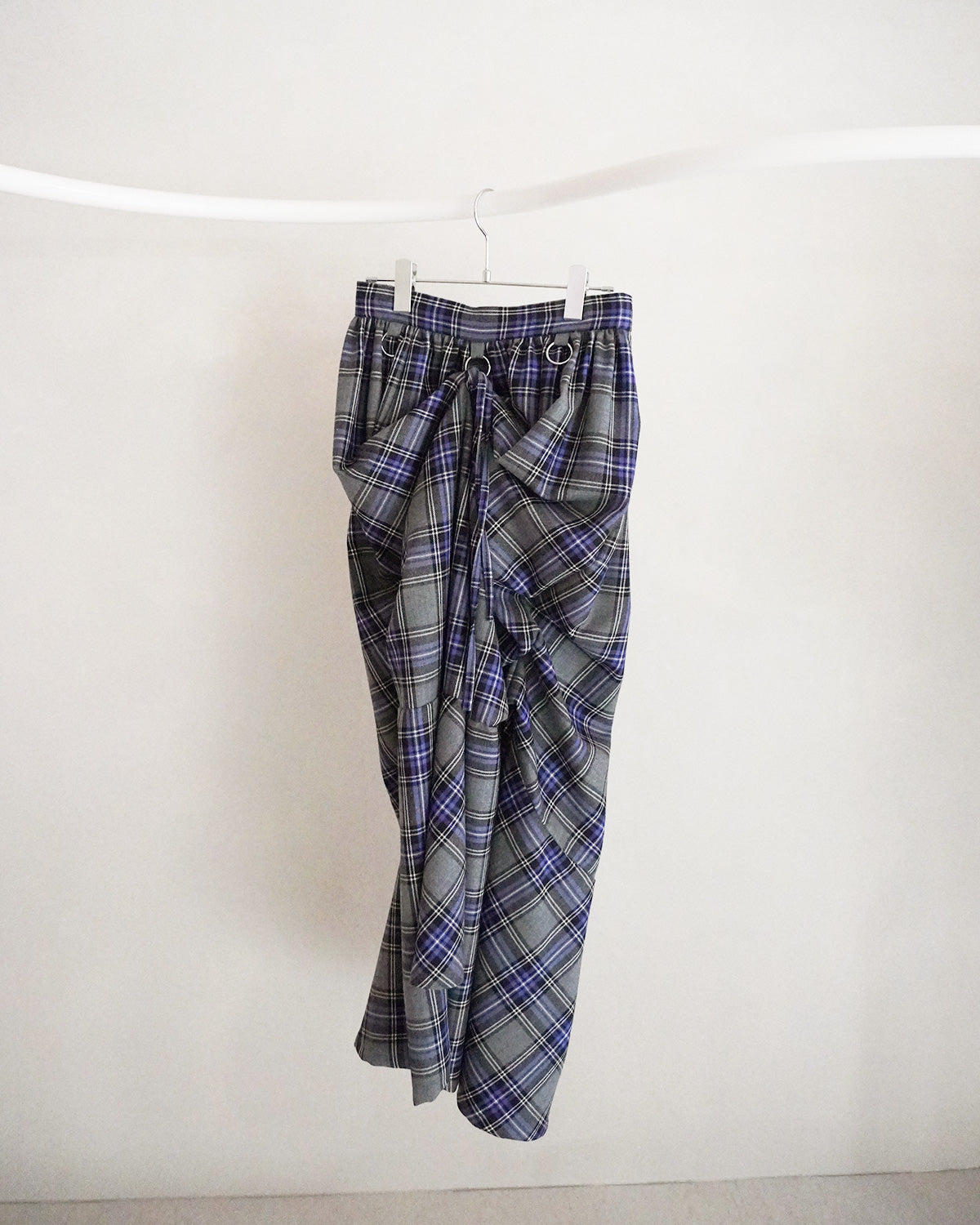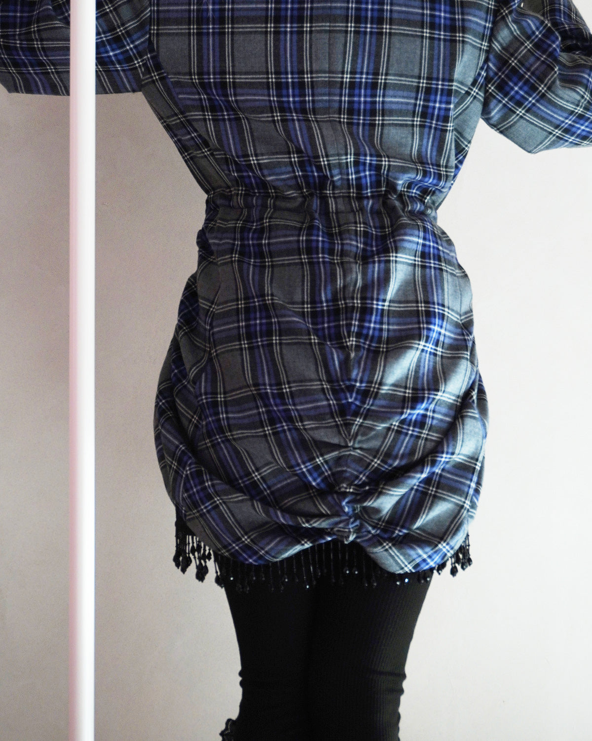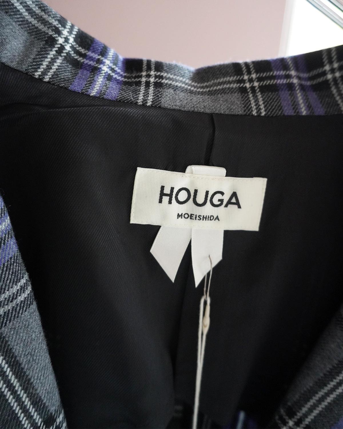 紫が印象的なウールのタータンチェック素材を使用したショート丈ドレスのようなジャケット。