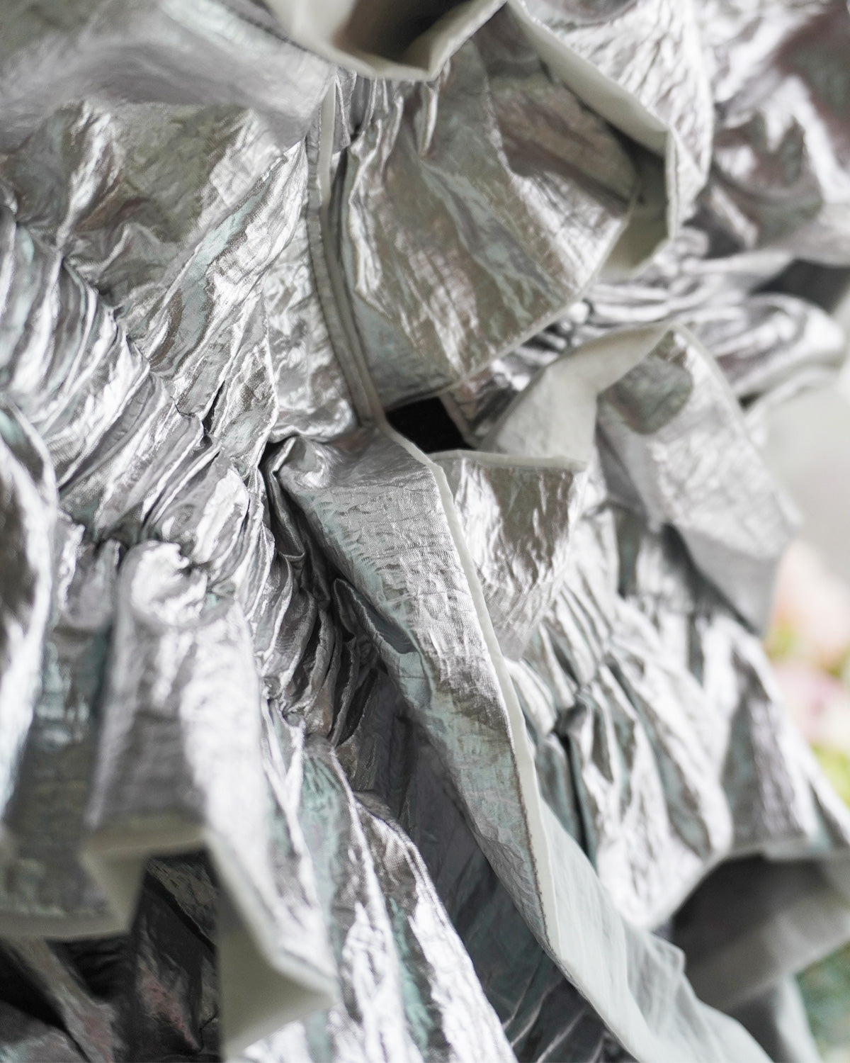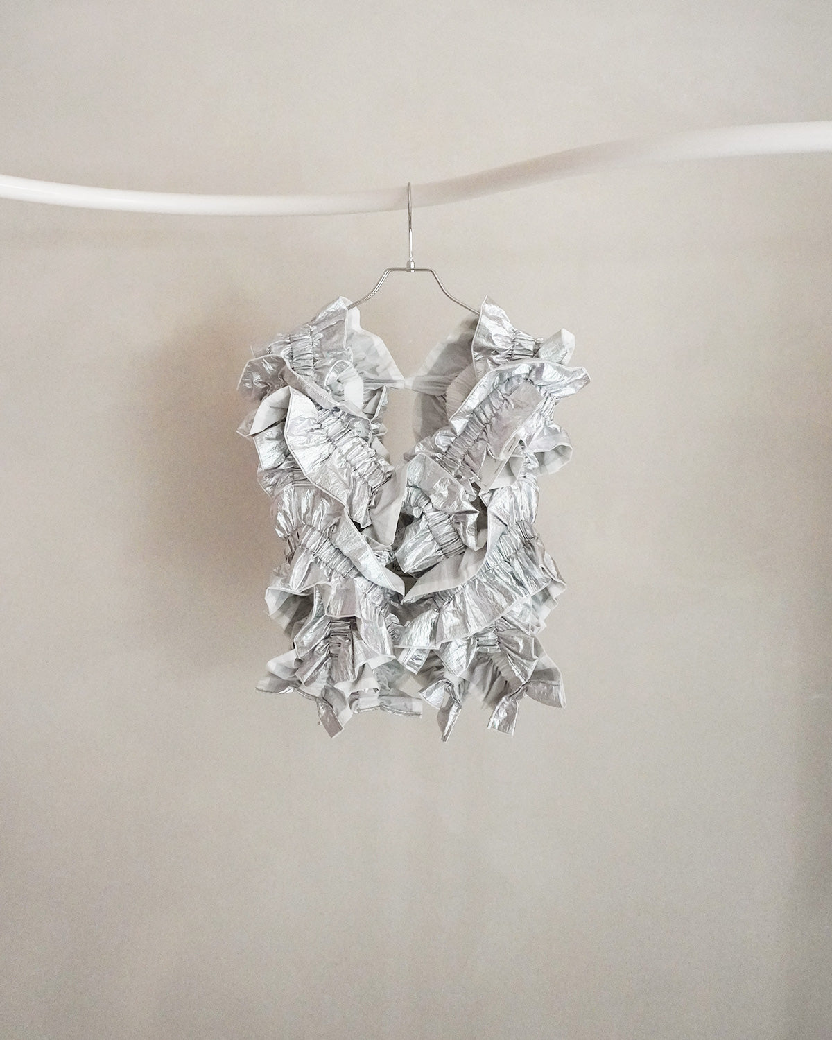 箔コーティングをしたナイロン100%のオーガンジーとナイロンタフタをドッキングしたリバーシブルのフリルベスト。 Tシャツやブラウスに重ねてアクセサリー感覚で日常に取り入れられるドレスピースです。