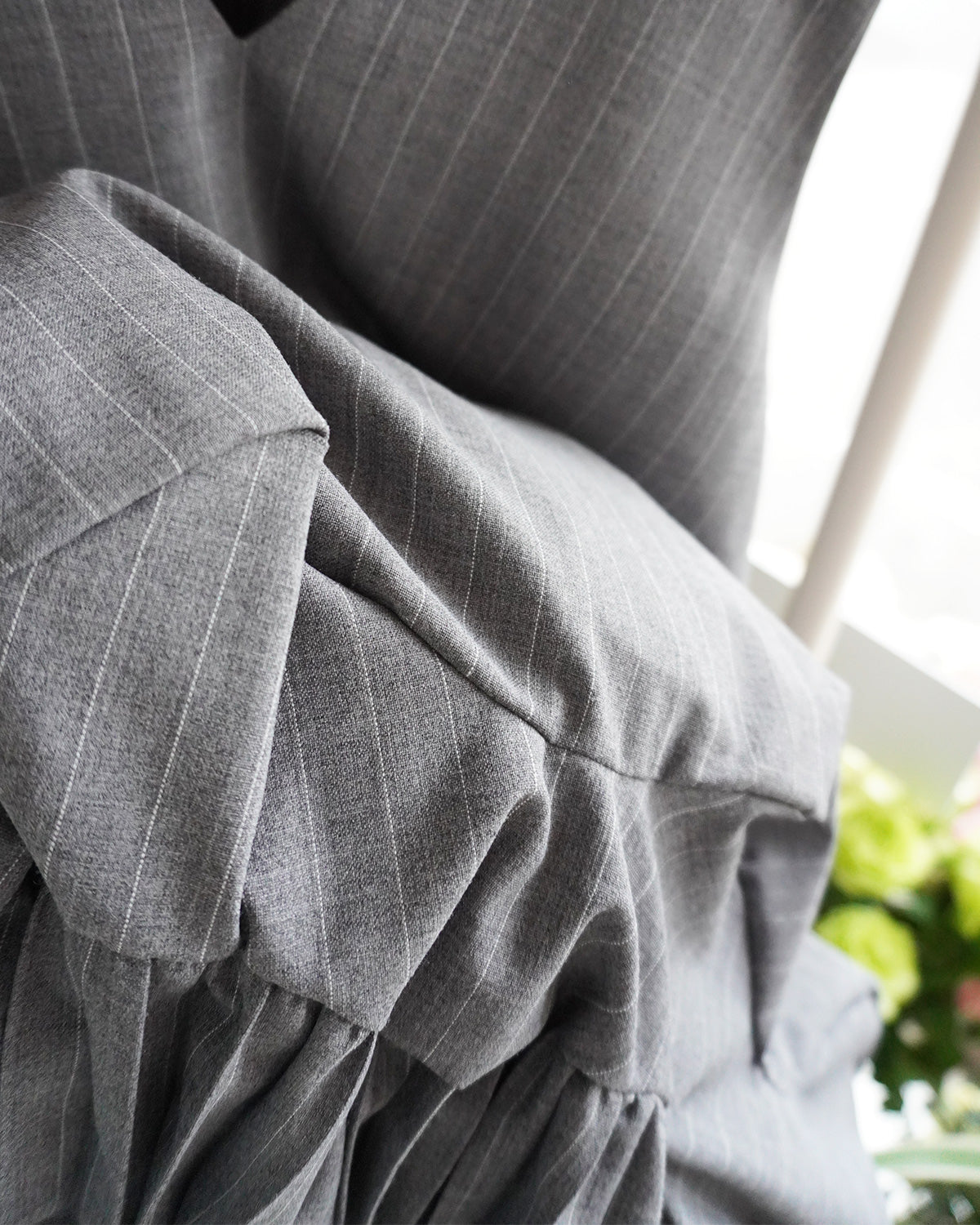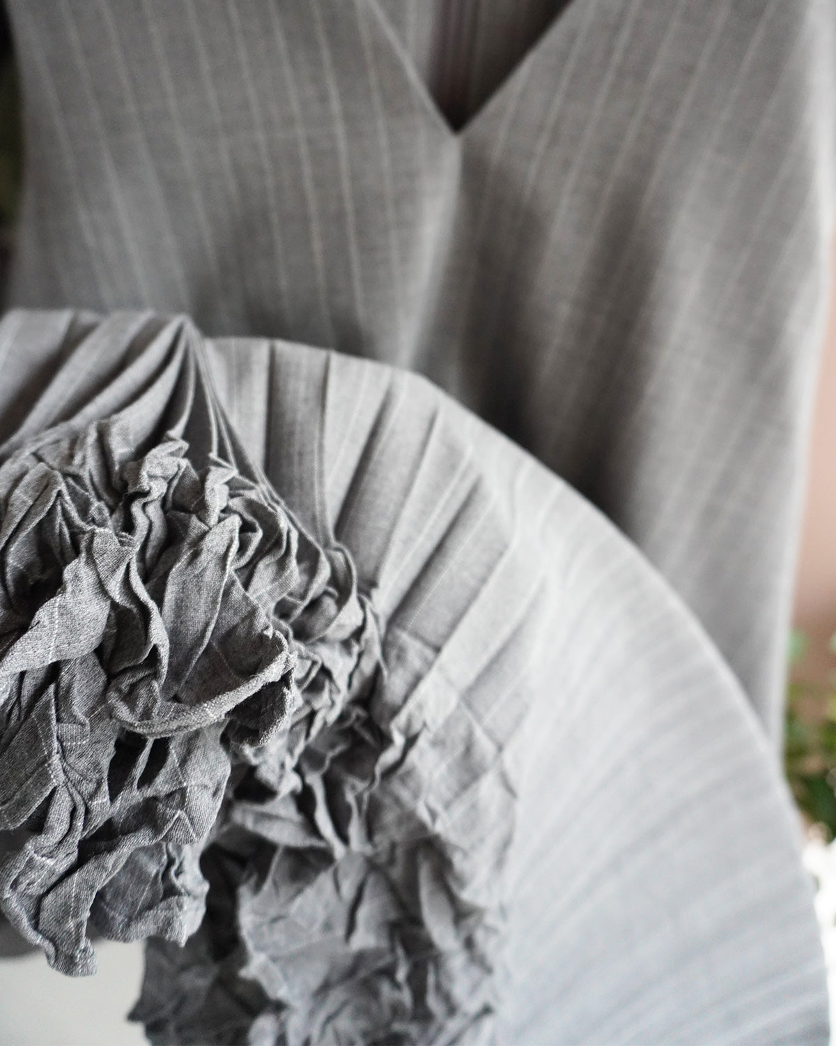 トゲのある曲線の切替と裾のクラッシュプリーツで形作られたコクーンシルエットは、内面の強さと優しさを表現。