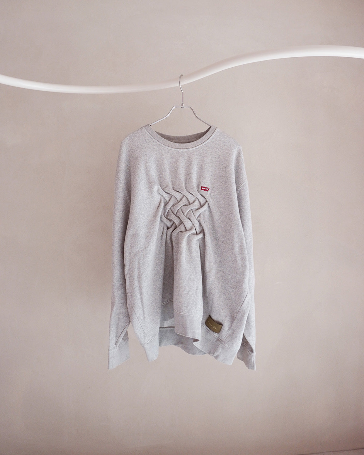 古着のスウェットにスモッキングを施したリメイクウェア。