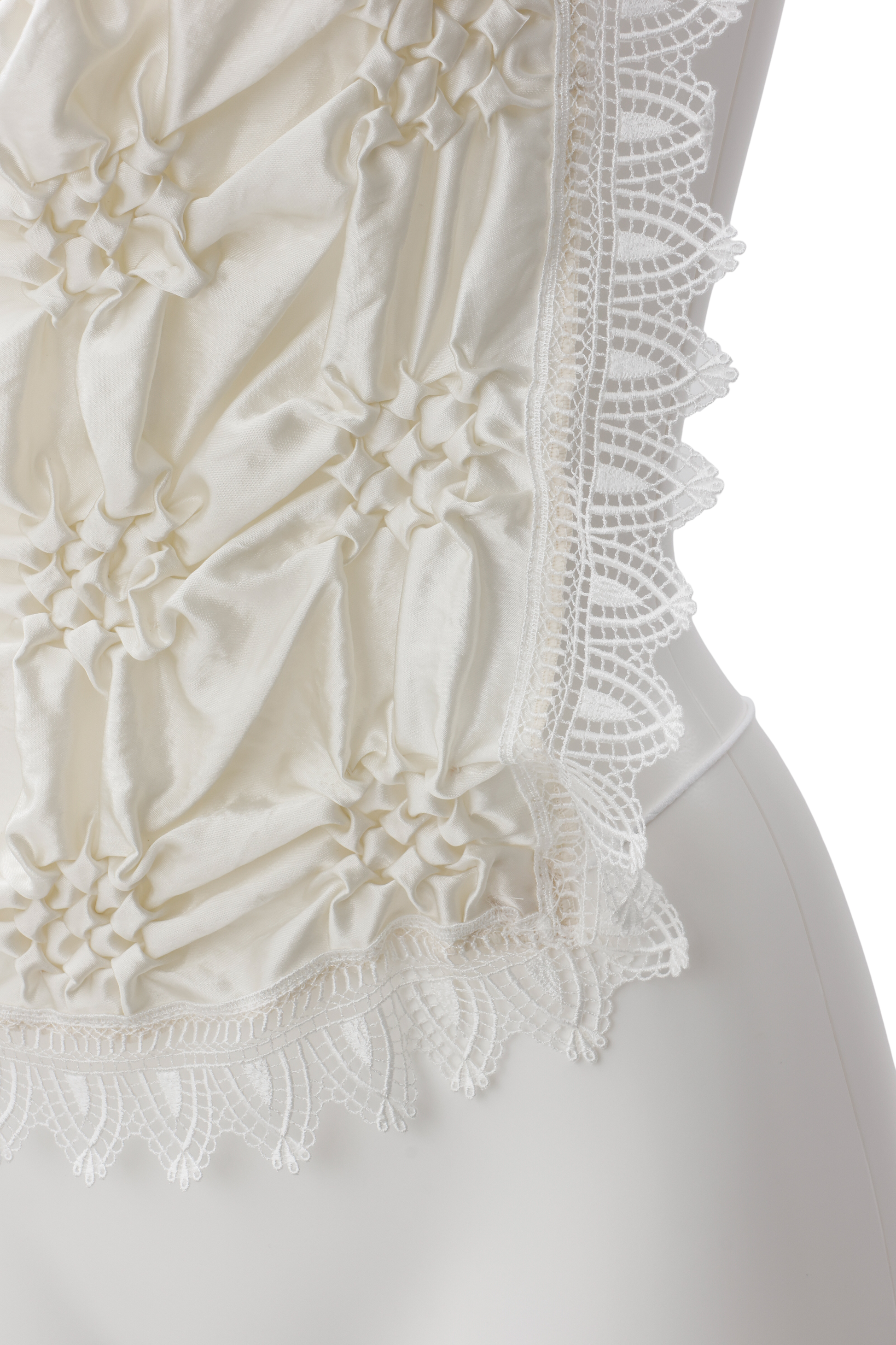 スカーフのような正方形の布にスモッキングを施し、レースで囲うことでスイートなムードに。