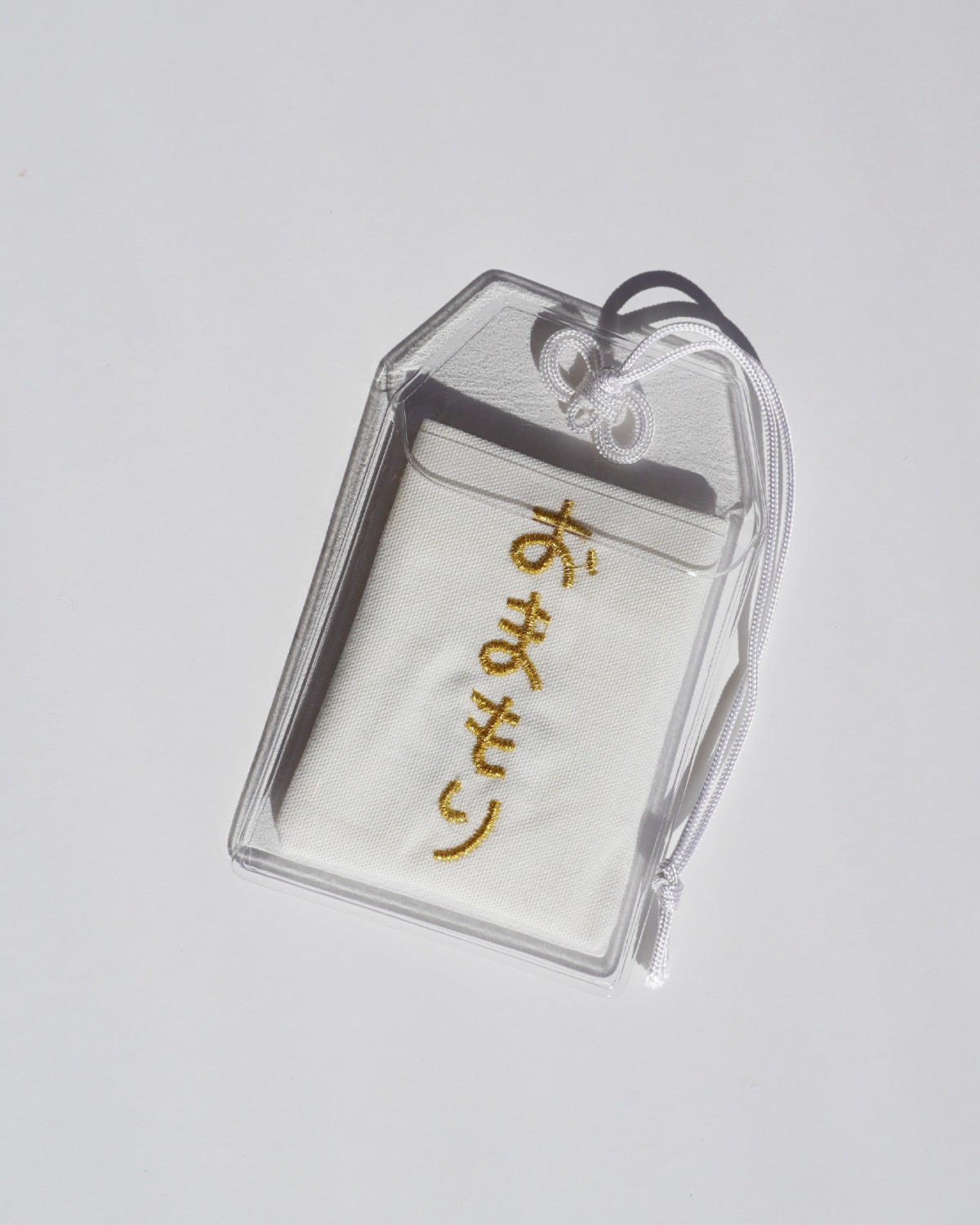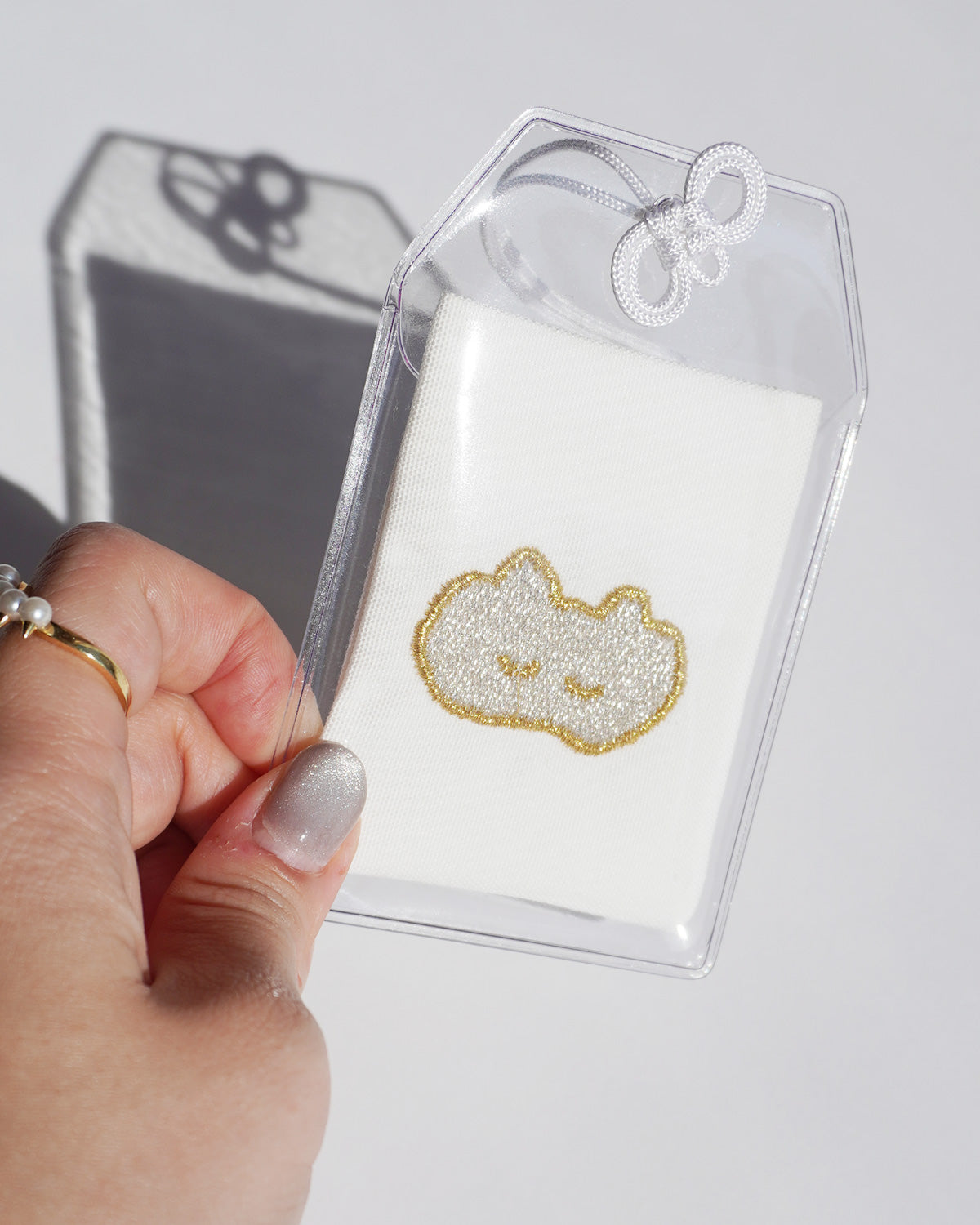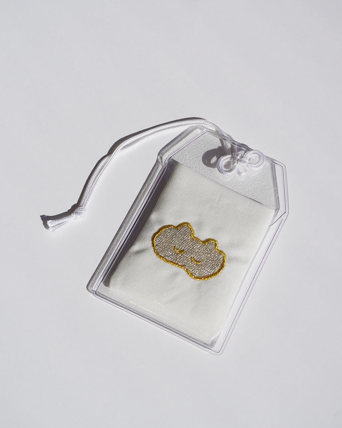 ねこの絵が刺繍されたてづくりおまもり。
